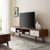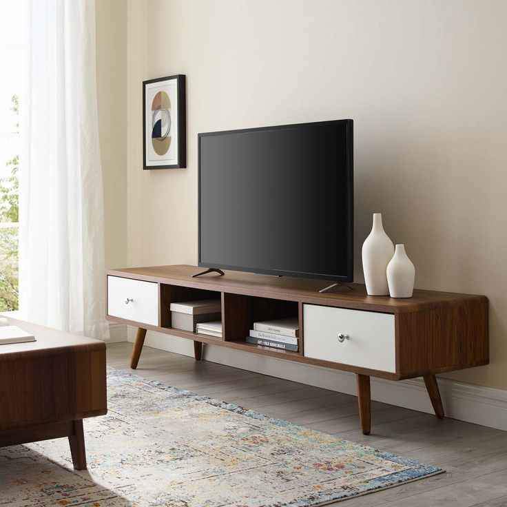 Meuble TV deux tons marron et blanc. Design moderne et fonctionnel.