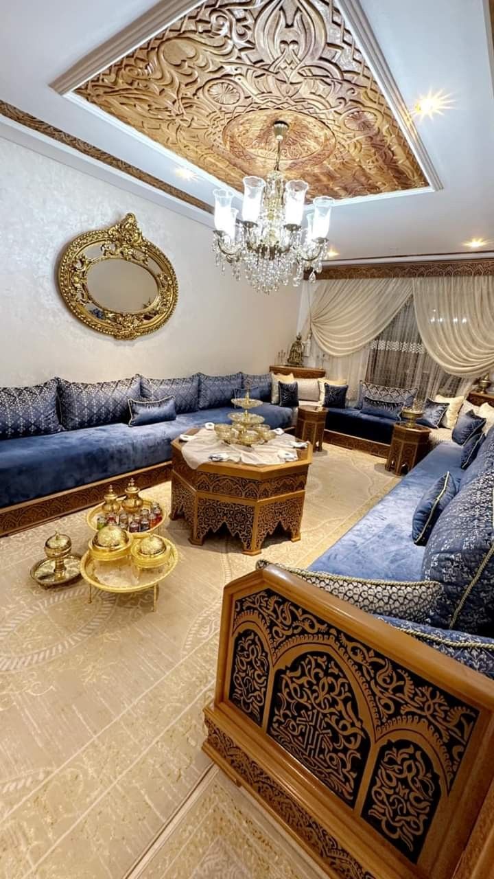 Apportez une touche de prestige à votre intérieur avec ce salon marocain beige et doré, symbole d’élégance et de raffinement. Son plafond finement sculpté met en valeur l’architecture traditionnelle marocaine, tandis que les finitions dorées ajoutent une dimension luxueuse à l’ensemble.